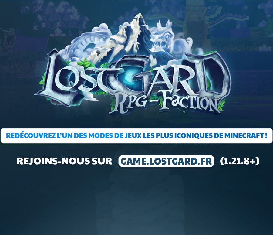 Lostgard est le premier serveur RPG/Faction en France, disponible en 1.21.8+ ! + de 200 items customisés, une nouvelle dimension avec des nouveaux monstres, des divinités, et bien plus encore à découvrir en venant jouer sur le serveur !